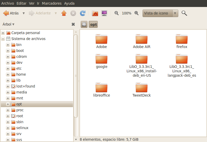 /opt/ es el «Archivos de programa» en Ubuntu, los nuevos programas que ustedes instalen, irán en el directorio /opt/. Para editar cualquier carpeta, borrar o añadir deberán hacerlo desde la terminal con derechos de administrador.