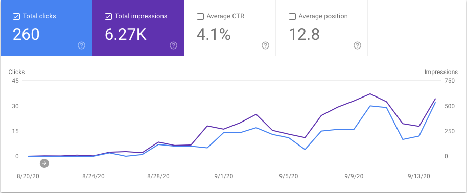 Hay un pequeño cambio en la cantidad de clics e impresiones. Considero que eso se debe a que al migrar borré entradas irrelevantes de mi blog. Sin embargo, notarán que la posición promedia subio 7 puntos.